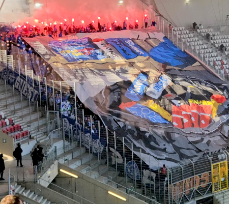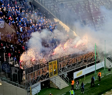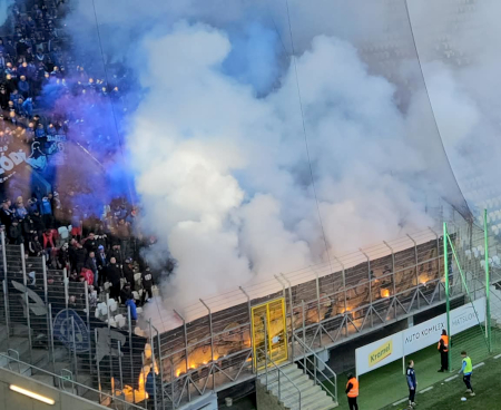 W sektorze gości świece dymne i mnóstwo innej pirotechniki.